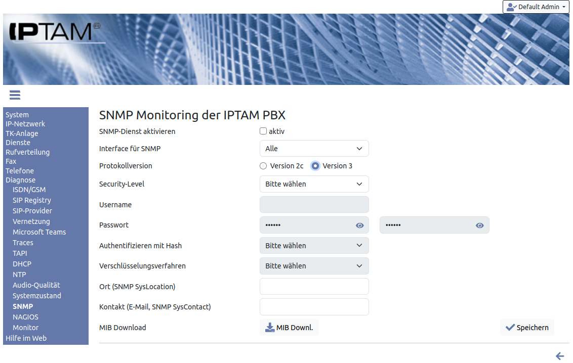 Zu den Standarddaten eines Systems gehören die MIB-Variablen SysLocation und SysContact. Die Daten können Sie in den Feldern „Ort“ und „Kontakt“ eintragen.Die MIB der IPTAM® PBX können Sie über den Button „MIB Download“ herunterladen.