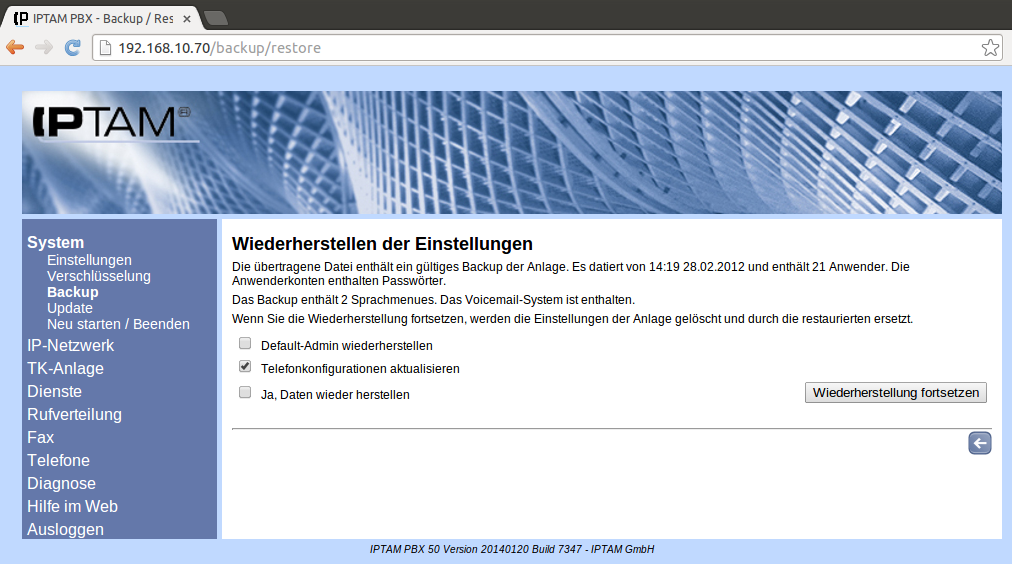 Wenn die Einstellung „Telefonkonfigurationen aktualisieren“ aktiviert ist, werden die Konfigurationsdateien der Telefone anhand der Daten aus dem Backup neu generiert, andernfalls werden die gesicherten Dateien direkt verwendet. Setzen Sie diese Option unbedingt, wenn die IP-Adresse der Anlage sich gegenüber der aus dem Backup geändert hat oder wenn das Backup aus einer früheren Version der IPTAM® PBX stammt. Wenn Sie hingegen manuelle Änderungen an den Dateien vorgenommen haben, sollten Sie die Option nicht setzen. In allen anderen Fällen ist die Einstellung ohne Relevanz, weil die neu generierten Dateien den gesicherten entsprechen.