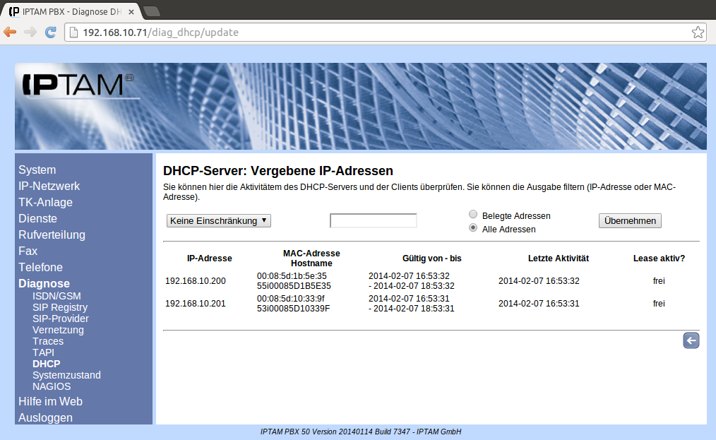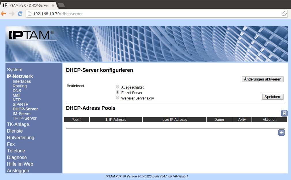 Wenn Sie Netzwerk-Einstellungen (IP-Adresse, Default-Gateway, Uhrzeit per Netzwerk) an der IPTAM® PBX nach der Aktivierung des DHCP-Servers ändern, müssen Sie den DHCP-Server deaktivieren und wieder aktivieren, damit die Änderungen an Ihre Endgeräte verteilt werden.
