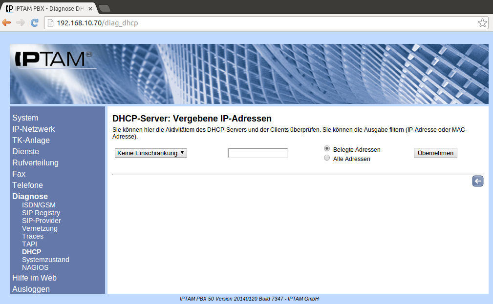 Wenn Ihre Telefone für die Provisionierung kein DHCP benötigen, können Sie wahlweise den DHCP-Server der IPTAM® PBX oder eine eventuell bereits vorhandenen DHCP-Dienst verwenden.