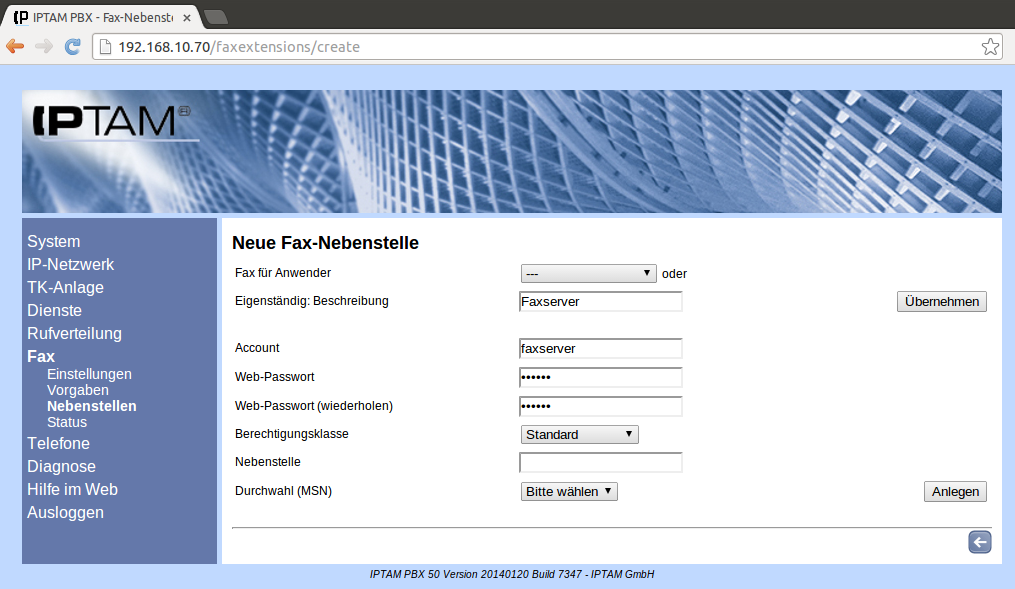 Die Abbildung zeigt diesen Dialog zur Konfiguration einer anwenderunabhängigen Fax-Nebenstelle die den Namen „Faxserver“ erhalten hat. Für eine anwenderunabhängige Nebenstelle müssen Sie zunächst im Feld „Account“ einen Account für diese Nebenstelle festlegen. Dieser Account dient zur Anmeldung an der Web-Oberfläche der IPTAM® PBX. Wie für alle Anwender können Sie ein Web-Passwort zur Anmeldung an der Telefonanlage festlegen. Im Feld Berechtigungsklasse legen Sie fest, welche Ziele die Fax-Nebenstelle anrufen darf. Schließlich müssen Sie noch die Durchwahl für die Fax-Nebenstelle festlegen. Sofern Ihre IPTAM® PBX an einem ISDN Mehrgeräteanschluss betrieben wird, können sie im Auswahlfeld „Durchwahl (MSN)“ festlegen, unter welcher MSN diese Fax-Nebenstelle von extern erreichbar ist. Wird Ihre IPTAM® PBX an einem ISDN Anlagenanschluss betrieben, so ist die Nebenstelle auch gleichzeitig die Durchwahl von extern. Sichern Sie Ihre Einstellungen über den Button „Speichern“. Damit erweitert sich die Eingabemaske wie in der Abbildung dargestellt.