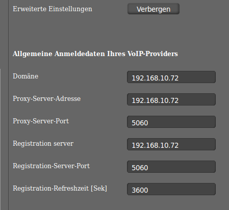 Klicken Sie auf erweiterte Einstellungen. Dort tragen Sie in die Felder „Domäne“, „Proxy-Server-Adresse“ und „Registration-Server“ die IP-Adresse Ihrer IPTAM PBX ein. Einstellungen für STUN Server und Outboundproxy lassen Sie inaktiv. Sichern Sie die Einstellungen durch einen Klick auf die entsprechende Schaltfläche.
