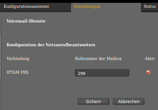 Unter Telefonie►Voicemail-Dienste tragen Sie die Nebenstelle zur Abfrage der Voicemail ein, wie Sie sie unter Dienste►Rufnummern in der IPTAM PBX eingerichtet haben.