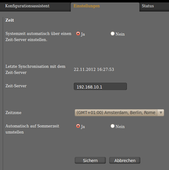 Im Formular System►Datum und Uhrzeit können einstellen, dass das Telefon die Uhrzeit über das Netzwerk bezieht. Wenn die IPTAM PBX in Ihrem Netz die Uhrzeit bereitstellt, tragen Sie bei Zeitserver die IP-Adresse Ihrer IPTAM PBX ein.