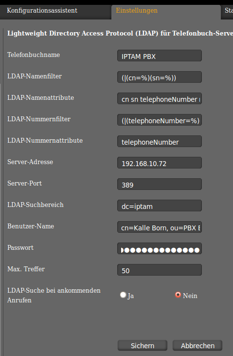 Möchten Sie das Telefonbuch der IPTAM PBX vom Telefon aus nutzen, können Sie die LDAP-Fähigkeit des Telefons verwenden. Aktivieren Sie den LDAP-Server für das Telefonbuch der IPTAM PBX (falls noch nicht aktiv). Klicken Sie in der Web-Oberfläche des Telefons auf den Punkt Zusatzdienste►LDAP. Sie sehen die Maske wie in der nebenstehenden Abbildung. Wählen Sie einen Namen für das Telefonbuch und tragen Sie LDAP-Nummernattribute den Wert „telephoneNumber“ ein. Bei der Server-Adresse tragen Sie die IP-Adresse Ihrer IPTAM PBX ein. Für den LDAP-Suchbereich verwenden Sie den Text „dc=iptam“ und für den Benutzer-Namen den Wert „cn=Vorname Nachname, ou=PBX Benutzer, dc=iptam. Ersetzen Sie dabei „Vorname“ und „Nachname“ durch Vor- und Nachname des Anwenders, wie Sie ihn in der IPTAM PBX konfiguriert haben. Das Passwort wurde automatisch generiert. In der Beschreibung zum IPTAM Telefonbuch sehen Sie, von wo Sie es kopieren können. Speichern Sie die Einstellungen.