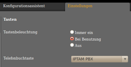 Um das IPTAM PBX Telefonbuch zum Standard des Telefons zu machen, klicken Sie auf Funktionstasten und wählen Sie bei Telefonbuchtaste das Telefonbuch aus. Ohne diese Einstellung verwendet das Telefon bei der Suche immer das interne Telefonbuch.