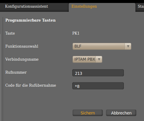 Möchten Sie Funktionstasten für das Besetztlampenfeld konfigurieren, um den Status anderer Nebenstellen signalisiert zu bekommen und Anrufe zu übernehmen, klicken Sie auf Funktionstasten und wählen Sie die Taste zum Bearbeiten aus. Tragen Sie die betreffende Nebenstelle bei Rufnummer ein und wählen Sie bei Code für die Rufübernahme die gleiche Einstellung wie in Ihrer IPTAM PBX unter Dienst Rufnummern bei Anrufübername.