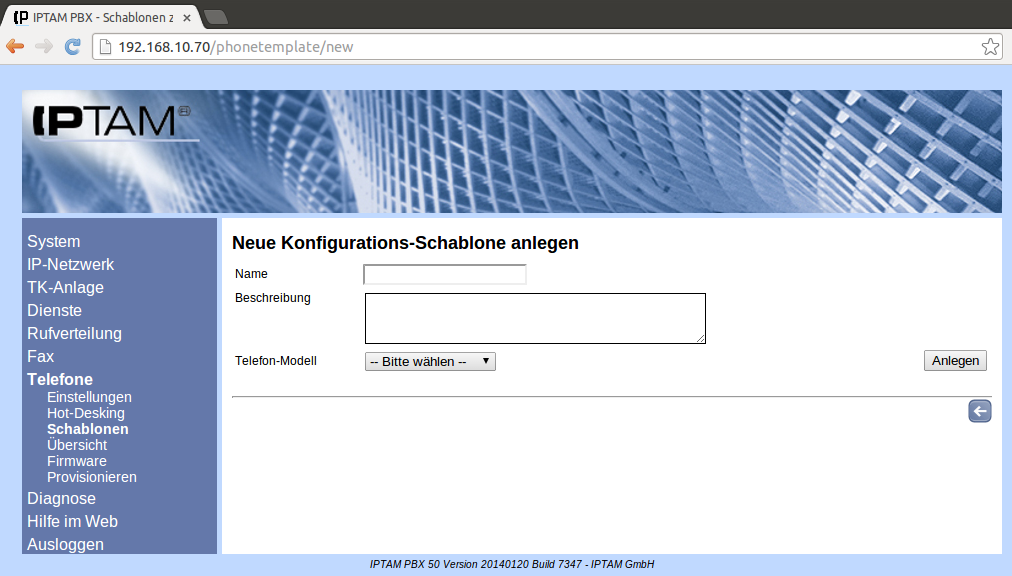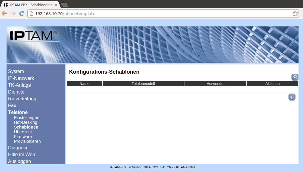 Image Die nebenstehende Abbildung zeigt die Übersicht der Schablonen im Menü Telefone ► Schablonen. Klicken Sie auf das Icon Button NEU.png , um eine neue Schablone anzulegen.