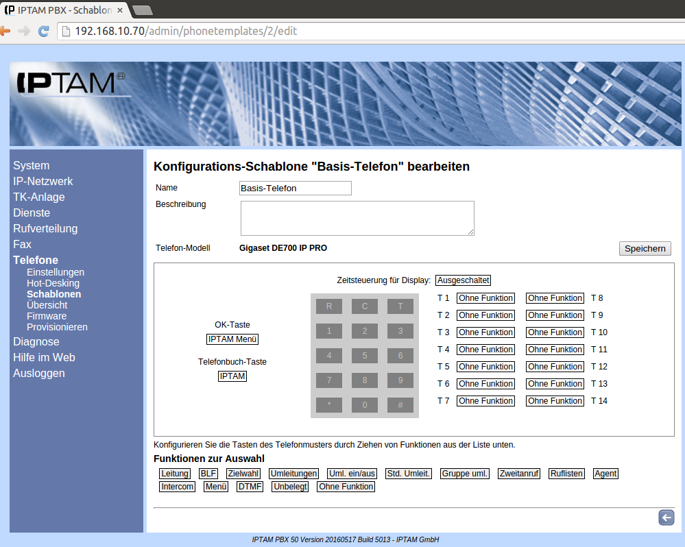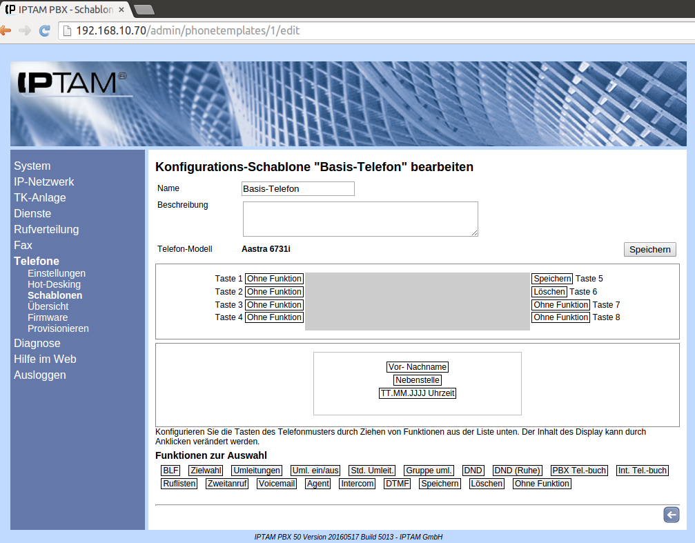 In den Abbildungen ist beispielhaft ein Aastra 6731, ein Gigaset DE700 IP Pro, ein Snom 370 und ein Tiptel IP 286 gezeigt. Sie sehen jeweils stilisiert die Tastenanordnungen. Um den Tasten eine Funktion zuzuweisen, wählen Sie den entsprechenden Button aus der unteren Liste aus und ziehen ihn per Drag & Drop auf die ausgewählte Taste. Wollen Sie die Belegung ändern, ziehen Sie einfach die neue Funktion auf die Taste. Möchten Sie eine Funktion wieder löschen, ziehen Sie de Button „Ohne Funktion“ auf die entsprechende Taste. Mit Klick auf den Button „Speichern“ sichern Sie die erstellte Konfiguration und gelangen zurück in die Übersicht der vorhandenen Telefonschablonen.