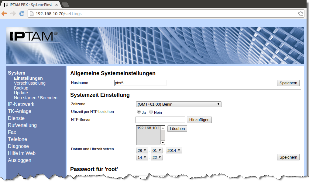 Soll ein NTP Server nicht über seine IP-Adresse sondern über seinen Rechnernamen erreicht werden, muss der IPTAM® IP-Telefonanlage zusätzlich auch ein gültiger DNS Server bekannt sein (siehe dazu DNS-Auflösung).