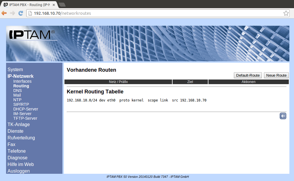 Image Um eine Default-Route festzulegen, über die Ihre IPTAM® IP-Telefonanlage andere Netze erreichen kann, klicken Sie auf den Button „Default-Route“. Dadurch öffnet sich die Maske zur Eingabe des Default Gateways, in die Sie die IP-Adresse des Rechners oder Routers eingeben, der die Verbindung zu anderen IP-Netzen herstellt. Die Default Route wird benutzt, um Rechner zu erreichen, deren IP-Adressen sich nicht im lokalen Netz befinden, in dem sich die IP-Telefonanlage befindet, und für die die Anlage auch keine statische Route kennt.