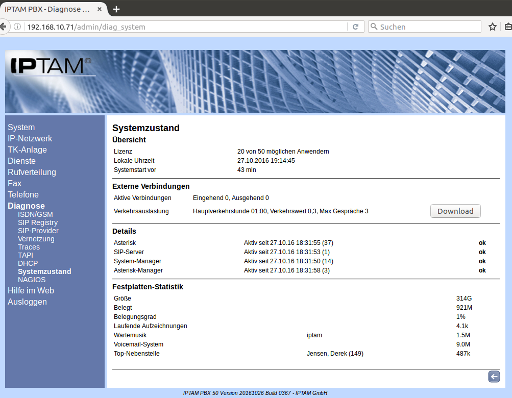Image Im Menü Diagnose ► Systemzustand wird Ihnen in der Zeile „Verkehrsauslastung“ die Hauptverkehrsstunde und die dazugehörige Auslastung angezeigt. Die Hauptverkehrsstunde ist die Stunde, in der die Auslastung maximal war. Die Auslastung ergibt sich aus den Gesprächsminuten je Gespräch: Ein Wert von eins ergibt sich z.B. aus einem einstündigen Telefonat, ebenso wie zwei Gespräche von einer halben Stunde.
