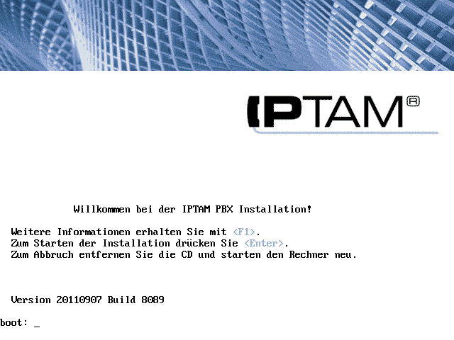 Wählen Sie „Installation“ aus, um die Installation der IPTAM® PBX auf der Festplatte zu starten.Sie aktivieren die Auswahl durch Drücken der Leertaste. Durch Drücken der Enter Taste wird die Auswahl akzeptiert und die Installation wird fortgesetzt.