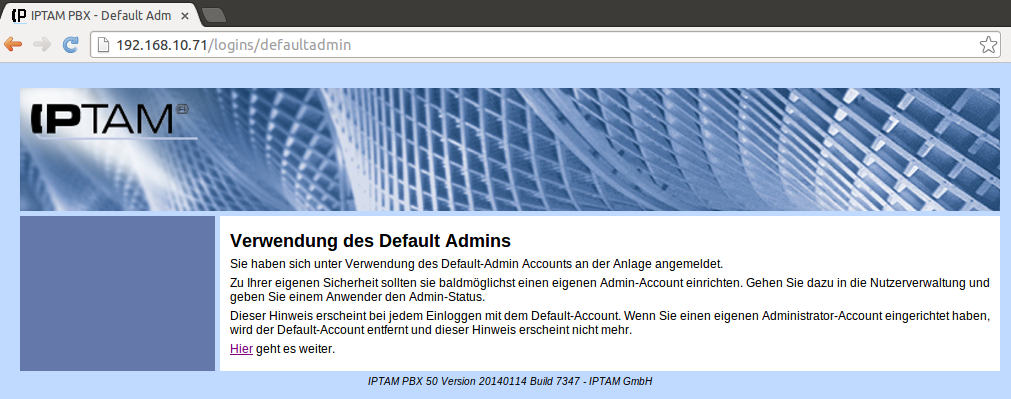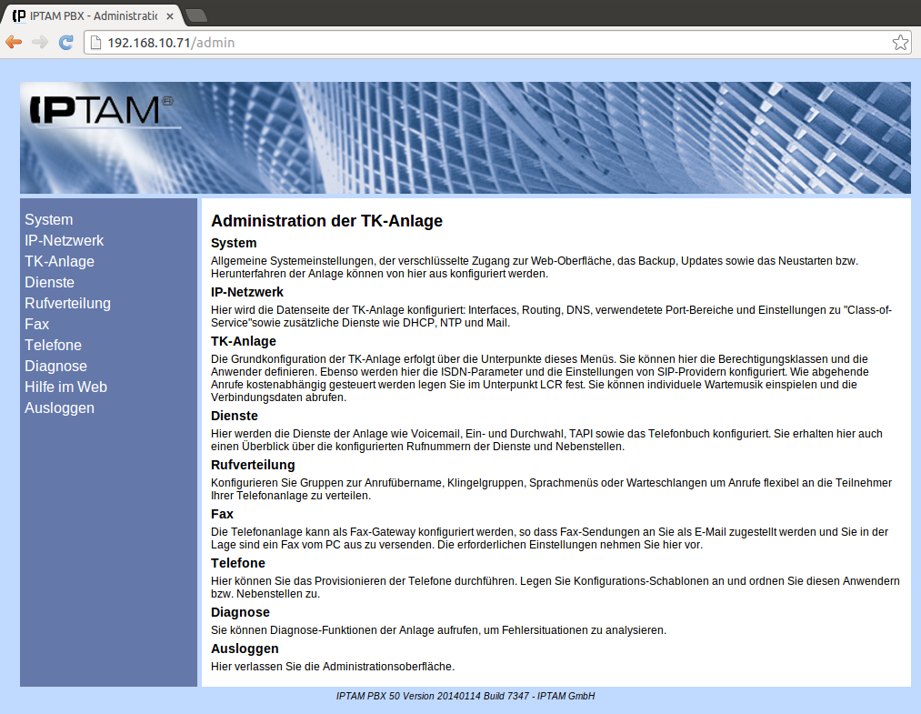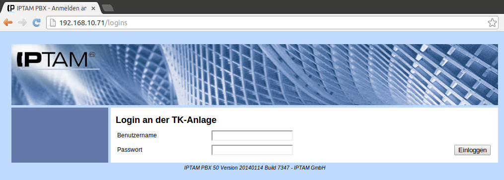 Nach der Installation der IPTAM® PBX erfolgt die weitere Bedienung und Konfiguration der IP-Telefonanlage über das eingebaute Web-Interface.Alternativ können Sie auch den verschlüsselten Zugang https://IP-Adresse verwenden (vgl. Zugangsmöglichkeiten zur Web-Oberfläche).