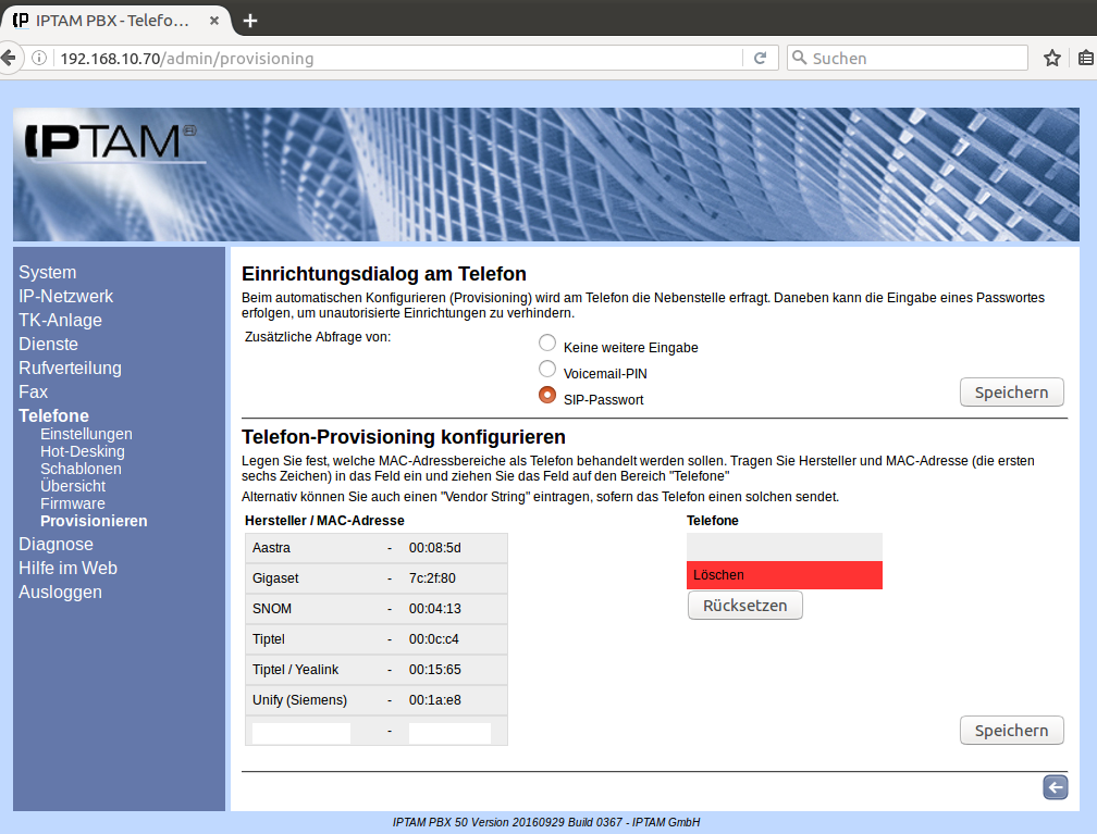 Image Handelt es sich um ein bisher nicht verwendetes Telefon, so erkennt Ihre IPTAM® PBX dies und stellt auf dem Telefon einen Einrichtungsdialog dar. Im Rahmen dieses Dialogs wird durch den Anwender oder Administrator im Zuge des Rollouts die Nebenstelle und gegebenenfalls ein Passwort eingegeben. Im Menü Telefone ► Provisionieren kann eingestellt werden, ob und wenn ja welches Passwort abgefragt wird. Zur Auswahl stehen die Voicemail PIN des Anwenders oder das SIP-Passwort.