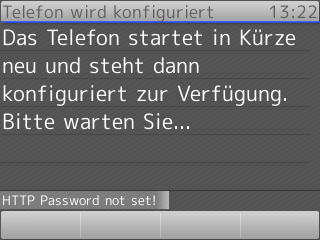 Wird das für den Anwender hinterlegte Telefon-Modell erkannt und stimmt das Passwort (falls es abgefragt wurde), so verknüpft die IPTAM® PBX das konkrete Telefon mit dem Anwender und startet das Telefon neu. In diesem Zuge erhält das Telefon dann die für den Anwender hinterlegte Telefonkonfiguration. Um eine eindeutige Ausgangssituation zu haben, sollten Sie bei bereits einmal verwendeten Telefonen ein „Rücksetzen auf Werkseinstellungen“ ausführen.