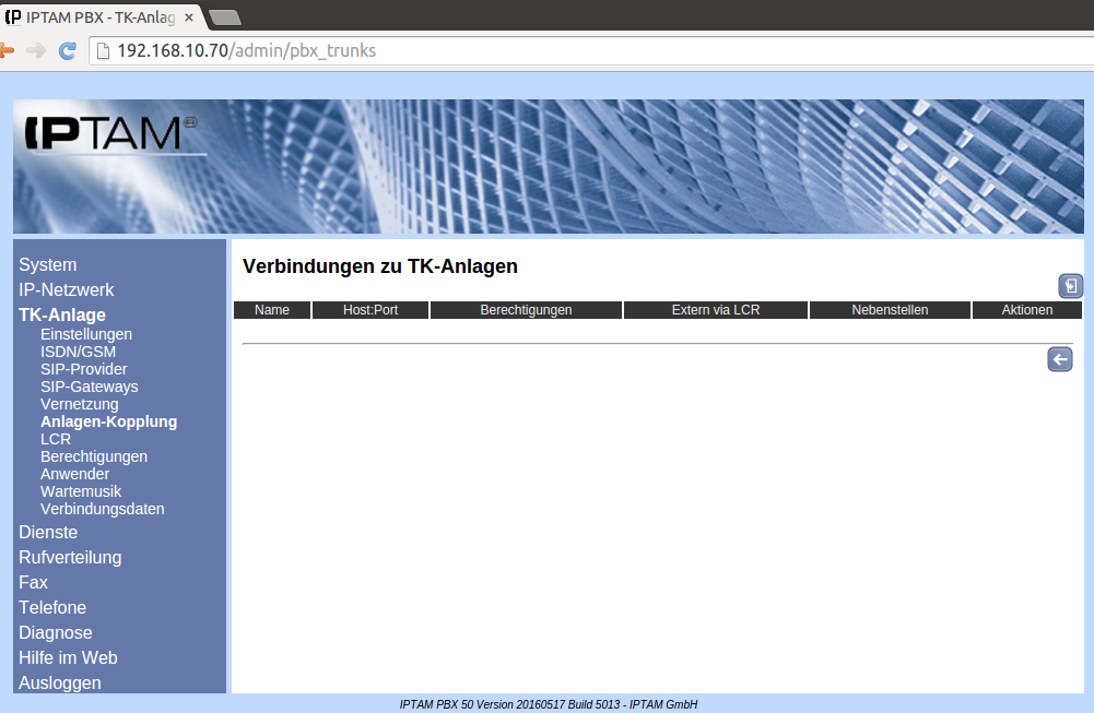 In Ihrem Unternehmen soll die vorhandene TK-Anlage nicht ersetzt sondern weiter betrieben werden? Die IPTAM® PBX unterstützt den gemeinsamen Betrieb mit vorhandenen TK-Anlagen neben der Kopplung mittels ISDN auch durch die Kopplung über Voice over IP (SIP). Die Einstellungen zur Kopplung mit einer vorhandenen TK-Anlage nehmen Sie im Menü TK-Anlage►Anlagen-Kopplung vor.