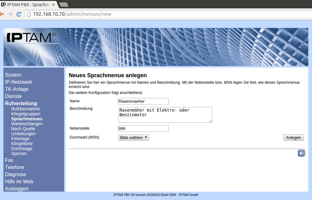 Image Im Feld „Name“ geben Sie z.B. den Text „Rasenmäher“ ein. Als Beschreibung wählen Sie „Rasenmäher mit Elektro- oder Benzinmotor“. Nun können Sie das Sprachmenü einer Nebenstelle zuweisen. Die Abbildung zeigt die Konfiguration bei Betrieb der IPTAM® PBX an einem ISDN Mehrgeräteanschluss. Hier können Sie eine interne Nebenstelle sowie eine von außen erreichbare MSN angeben. Setzen Sie Ihre IPTAM® PBX an einem ISDN Anlagenanschluss oder einem durchwahl­fähigen SIP-Account (SIP-DDI) ein, entfällt die Unterscheidung zwischen interner und exter­ner Rufnummer. In unserem Beispiel weisen wir das Sprachmenü „Rasenmäher“ der Nebenstelle 999 zu. Wenn das Sprachmenü nur als Untermenü erreichbar sein soll, wie es hier der Fall ist, ist es nicht notwendig, ihm eine Erreichbarkeit von außen in Form einer Durchwahl (MSN) oder einer extern erreichbaren Nebenstelle zuzuweisen.