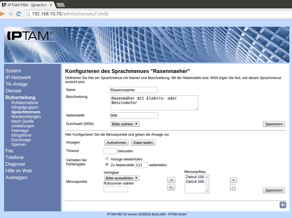 Image Klicken Sie auf den Button „Anlegen“ um das Sprachmenü anzulegen. Es öffnet sich die Maske zur Konfiguration des Sprachmenüs (siehe nebenstehende Abbildung). Nun können Sie die oben beschriebene Ansage aufnehmen. Hierzu drücken Sie den But­ton „Aufnehmen“. Die IPTAM® PBX ruft nun das Telefon an, an dem Sie zur Zeit ange­meldet sind. Als Absender-Rufnummer sehen Sie im Display Ihres Telefons „Voiceprompt Recording“. Sobald Sie das Gespräch annehmen erhalten Sie einen Signalton und können den Text für das Sprachmenü aufsprechen. Zum Beenden der Aufnahme drücken Sie die '#'-Taste oder legen Sie einfach auf. Um eine Ansage für ein Sprachmenü aufsprechen zu können, müssen Sie als in der Telefonanlage eingerichteter Anwender mit Administratorrechten angemeldet sein, da andernfalls die Telefonanlage nicht in der Lage ist, ein Telefon zu identifizieren, an dem die Aufnahme aufgesprochen werden kann. Als Alternative zum Aufsprechen der Ansage über das Telefon können Sie auch eine vorbereitete Sounddatei hochladen. Hierzu klicken Sie auf den Button „Datei laden“. Über einen Dialog „Ansage für Sprachmenü laden“ erhalten Sie ein Auswahlfeld, in dem Sie eine Datei von der Festplatte Ihres Computers auswählen und als Sounddatei für das Sprachmenü installieren können. Die IPTAM® PBX kann Sounddateien im Microsoft .wav oder im Ogg-Vorbis Format beim Hochladen verarbeiten.