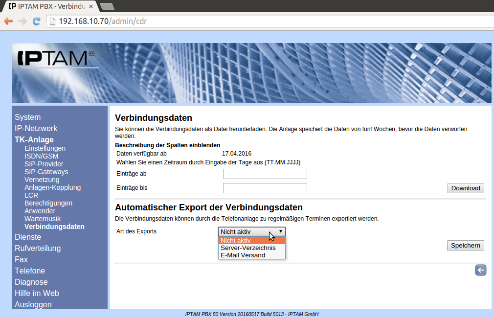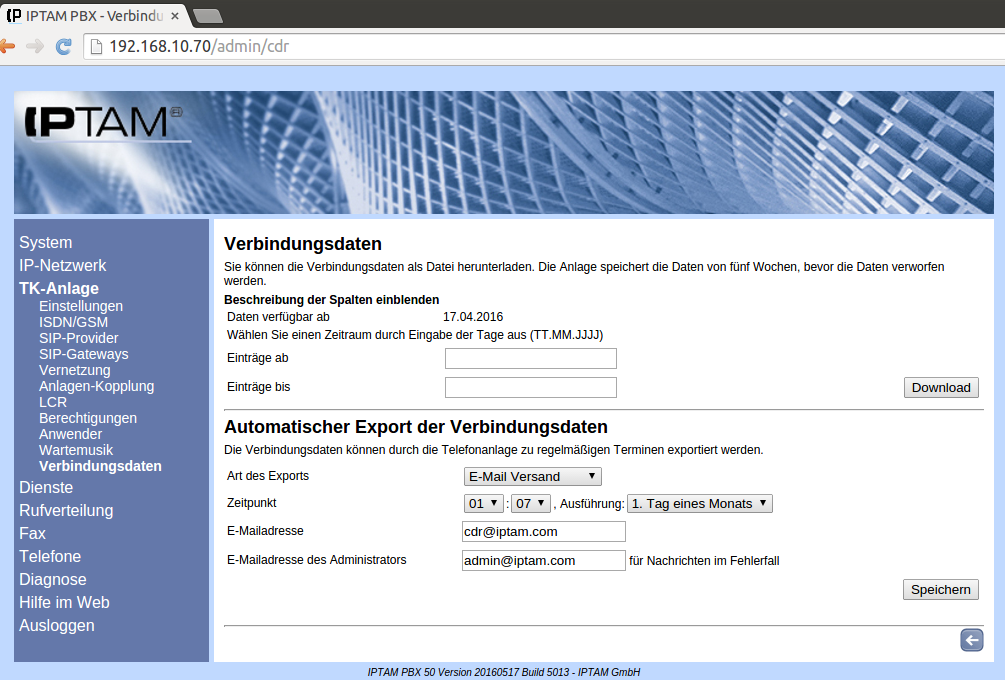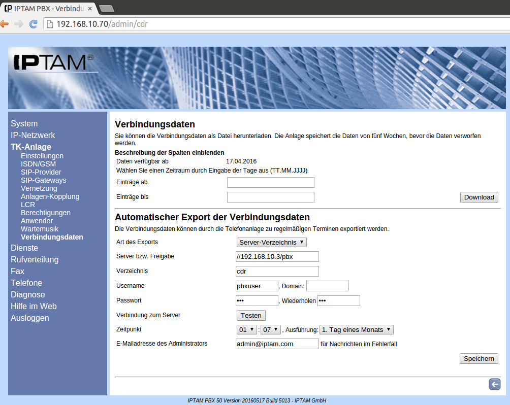TK-Anlage ► Verbindungsdaten im unteren Abschnitt (Siehe Abbildung links). Sie können die Daten auf einem Netzwerkspeicher ablegen lassen oder Sie erhalten Sie als Anhang einer E-Mail.