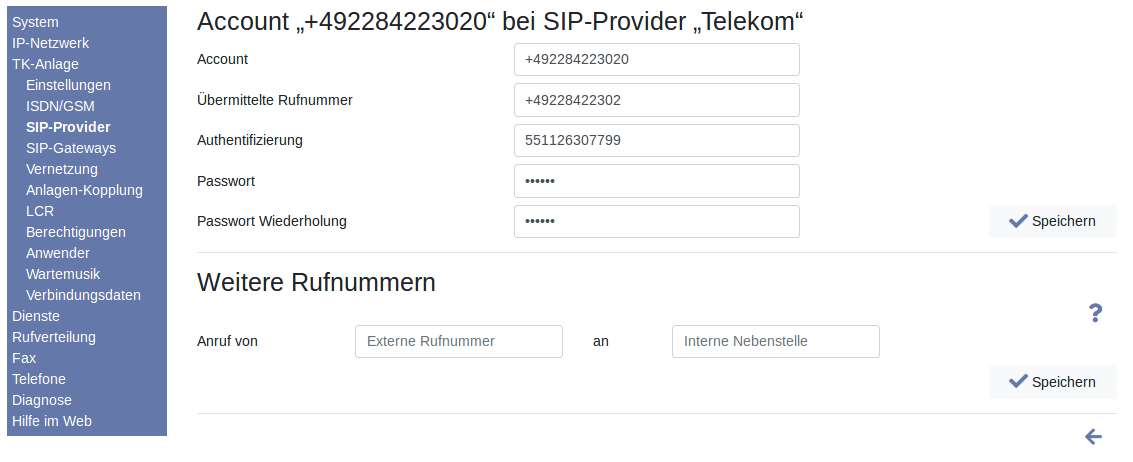 Unter Authentifizierung und Passwort werden die Werte eingetragen, die Ihnen vom Provider Deutsche Telekom AG mitgeteilt wurden.