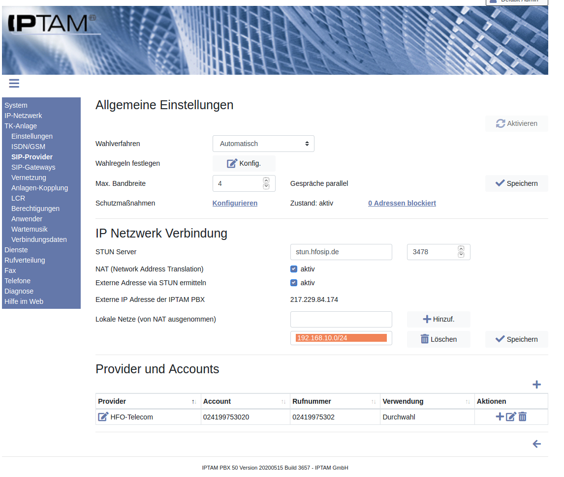 In der Regel wird Ihr Router eine feste externe IP-Adresse besitzen. Tragen Sie dann im Abschnitt „IP Netzwerk Verbindung“ diese Adresse ein und setzen Sie die Checkbox „NAT“. Falls Ihr Anschluss über eine dynamische IP-Adresse verfügt, tragen Sie bei „STUN-Server“ den STUN-Server des Providers „stun.hfosip.de“ ein und setzen Sie die Checkboxen bei „NAT“ und bei „Externe Adresse via STUN ermitteln“. Ihre IPTAM® PBX wird Änderungen der öffentlichen Adresse automatisch erkennen und eine Neu-Registrierung ausführen.