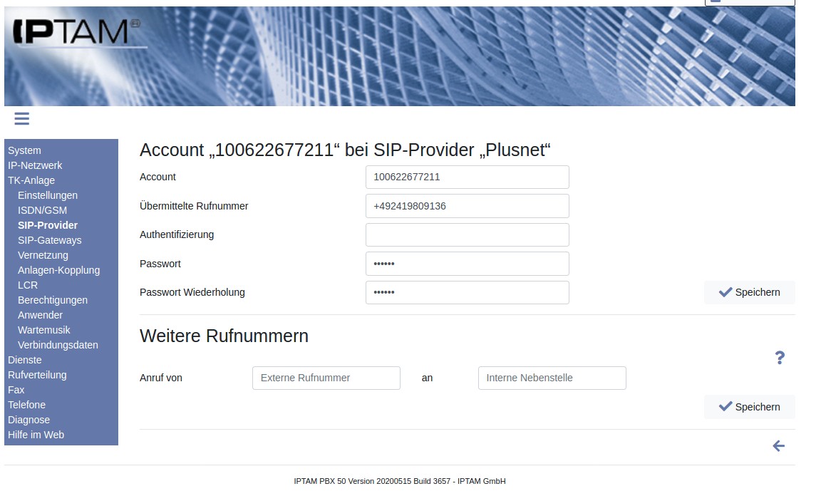 Image Mit dem Account registriert sich Ihre IPTAM® PBX beim Provider. Tragen Sie die Daten wie beispielhaft in der Abbildung gezeigt ein.