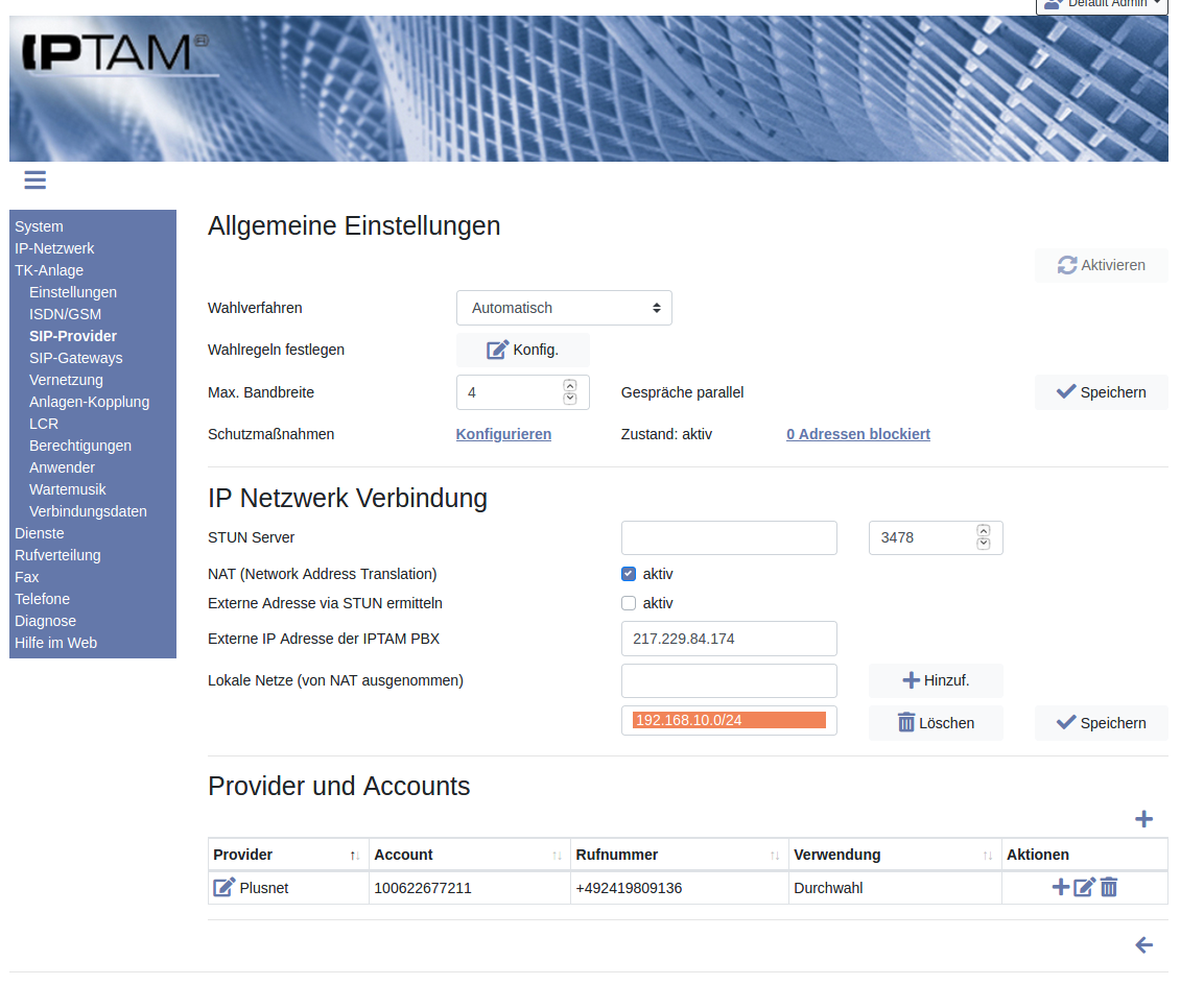 Bei „Lokale Netze (von NAT ausgenommen)“ tragen Sie das lokale Netz der Telefonanlage ein (z.B. 192.168.10.0/24, (Hinweise dazu). Ggf ergänzen Sie weitere Netze (z.B. wenn Sie Telefone via VPN an der IPTAM® PBX betreiben).