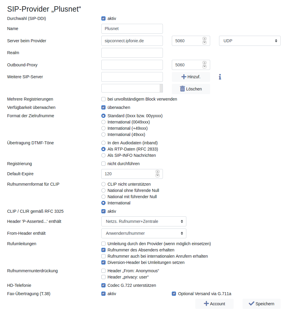 Bei Account wird der SIP-Account wie von Plusnet mitgeteilt eingetragen. Die „übermittelte Rufnummer“ wird im internationalen Format (+49xxx) eingetragen, wobei die Rufnummer ohne den Rufnummernblock verwendet wird. Das Passwort tragen Sie wie vom Provider Plusnet mitgeteilt ein.