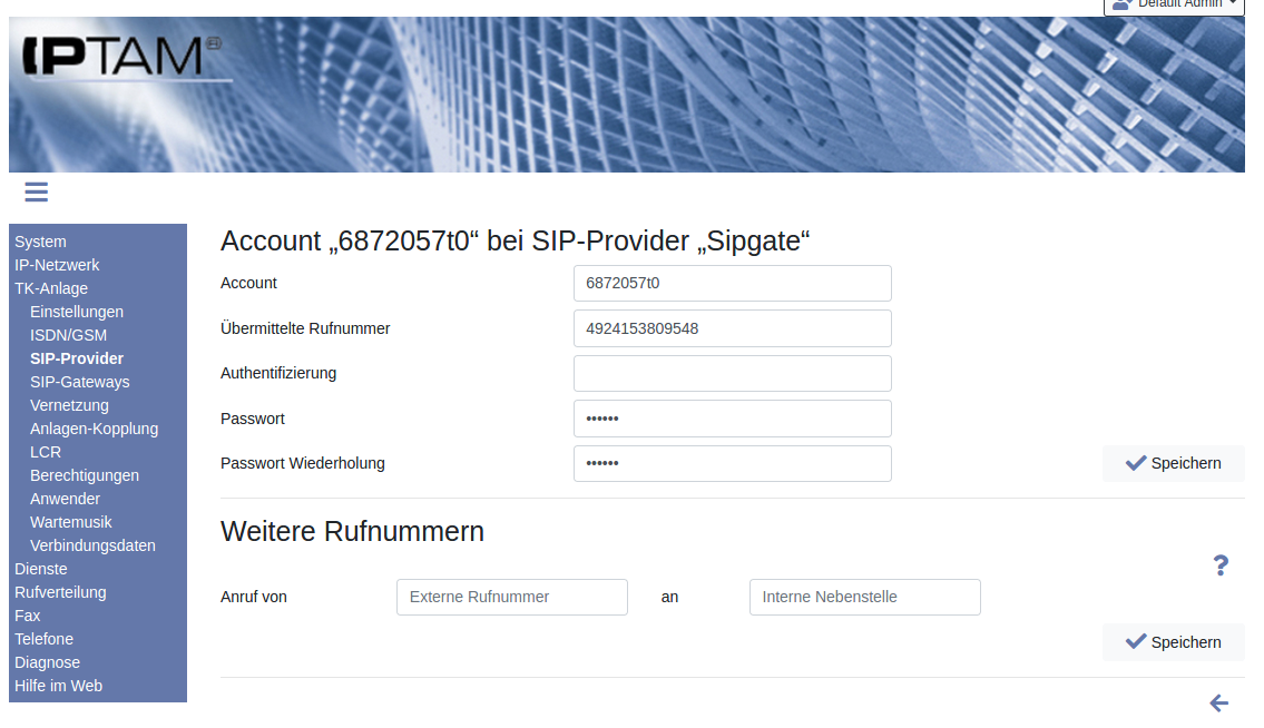Image Mit dem Account registriert sich Ihre IPTAM® PBX beim Provider. Tragen Sie die Daten wie beispielhaft in der Abbildung gezeigt ein.