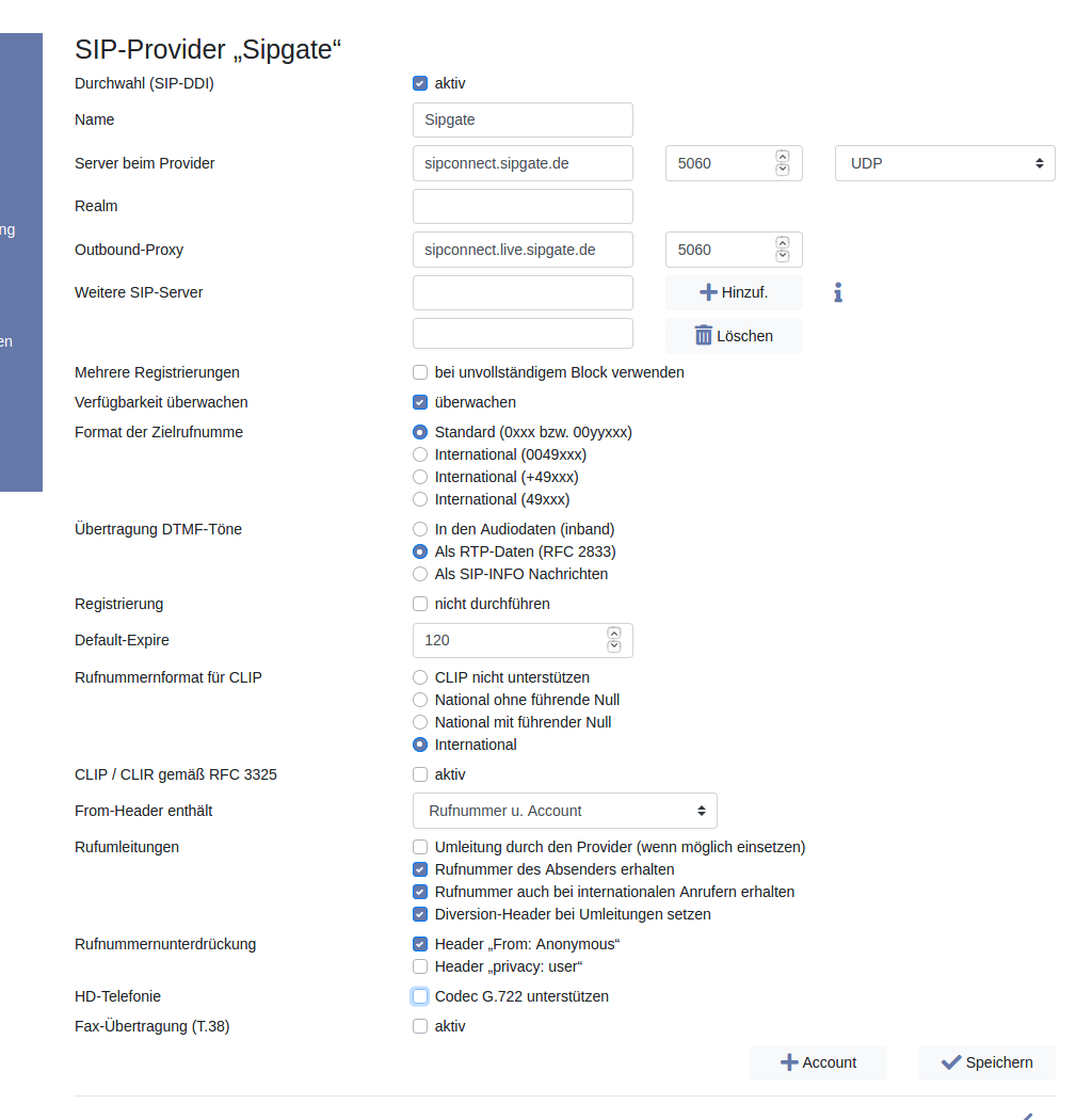 Bei Account wird der SIP-Account wie von Sipgate mitgeteilt eingetragen. Er endet üblicherweise mit „t0“. Die „übermittelte Rufnummer“ wird im internationalen Format (49xxx) eingetragen, wobei die Rufnummer ohne den Rufnummernblock verwendet wird. Das Passwort tragen Sie wie vom Provider Sipgate mitgeteilt ein.
