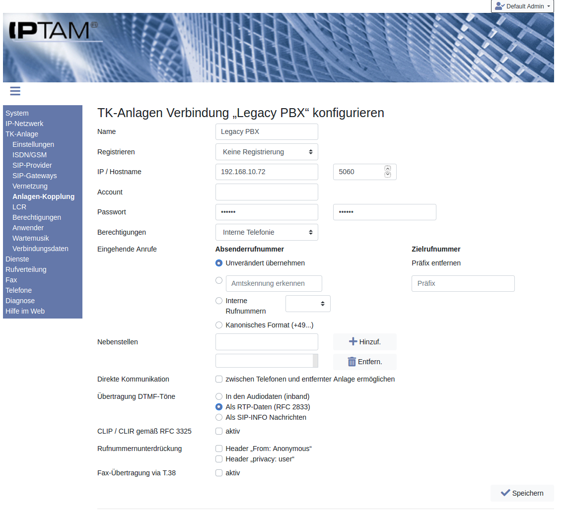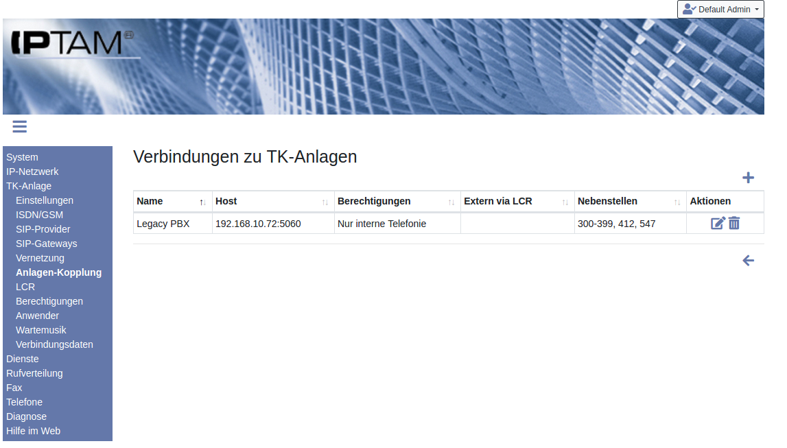 In Ihrem Unternehmen soll die vorhandene TK-Anlage nicht ersetzt sondern weiter betrieben werden? Die IPTAM® PBX unterstützt den gemeinsamen Betrieb mit vorhandenen TK-Anlagen neben der Kopplung mittels ISDN auch durch die Kopplung über Voice over IP (SIP). Die Einstellungen zur Kopplung mit einer vorhandenen TK-Anlage nehmen Sie im Menü TK-Anlage►Anlagen-Kopplung vor.