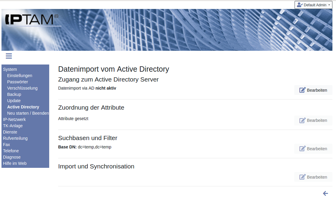 Bevor Sie die Verbindung mit dem AD aufbauen und Daten übernehmen können, müssen einige Daten in Ihrer IPTAM® PBX vorhanden sein: