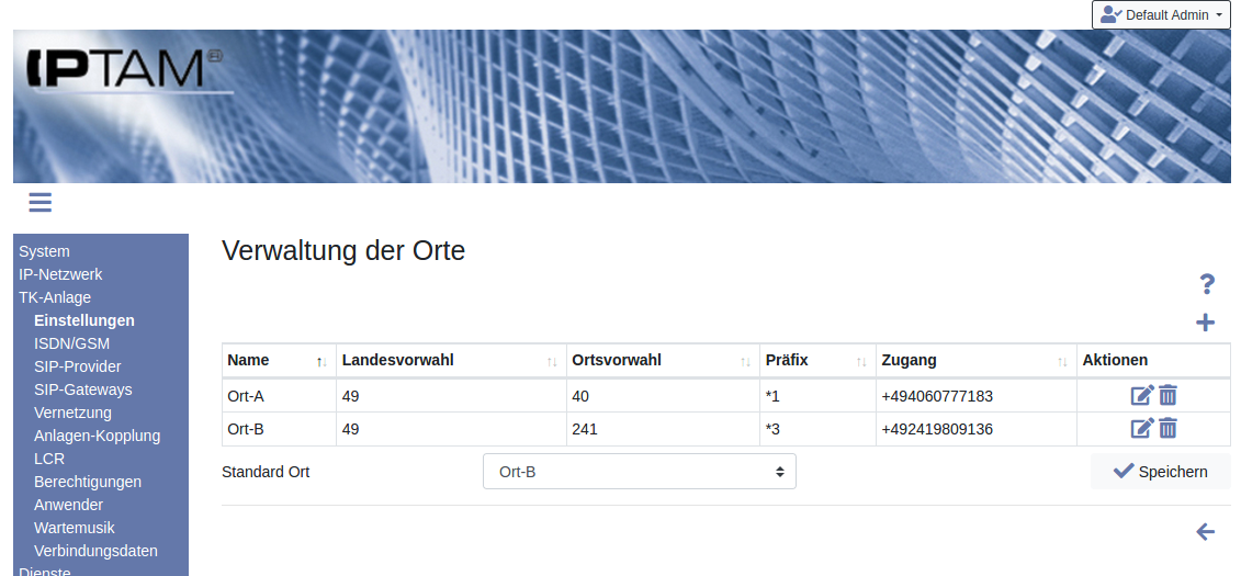 Image Image Wenn in der IPTAM® PBX mehr als ein Rufnummernblock bei den SIP Providern angelegt ist, erscheint unter TK-Anlage►Einstellungen der Button „ Orte“. Mit einem Klick gelangen Sie in die Verwaltung der Orte (Abbildung rechts).