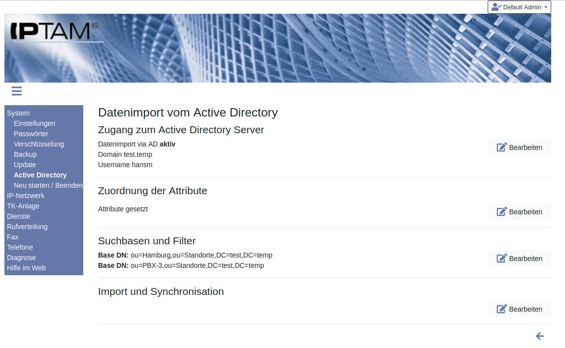 Image Falls Sie die Bestandsdaten Ihrer Anwender aus dem Active Directory beziehen, erweitern sich die Einstellungen in diesem Bereich. Links sehen Sie die Einstellungen zu den Suchbasen und Filtern. Sie können für jeden der Orte eine eigene Suchbassis und auch Filter festlegen. Details dazu finden Sie im Abschnitt Suchbasen und Filter.