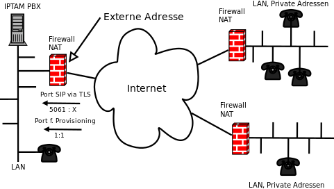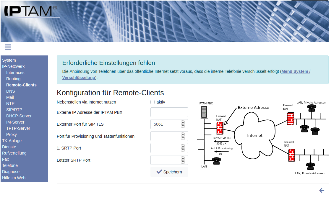Sie können Ihre IPTAM® PBX so konfigurieren, dass die Nebenstellen Ihrer Anwender über das Internet mit der Telefonanlage kommunizieren, wobei verschlüsselte Telefonie via SIP-TLS und SRTP zum Einsatz kommt. Das Provisionieren der Telefone erfolgt ebenfalls verschlüsselt per HTTPS. Diese Lösung ist interessant für die Integration von Homeoffice Arbeitsplätzen, Anschluss kleinerer Außenstandorte oder Filialen sowie auch für Fälle, wo Ihre IPTAM® PBX in einem Rechenzentrum gehostet wird.Diese Lösung ist für Telefone des Herstellers Snom sowie für geeignete Softphones vorgesehen.
