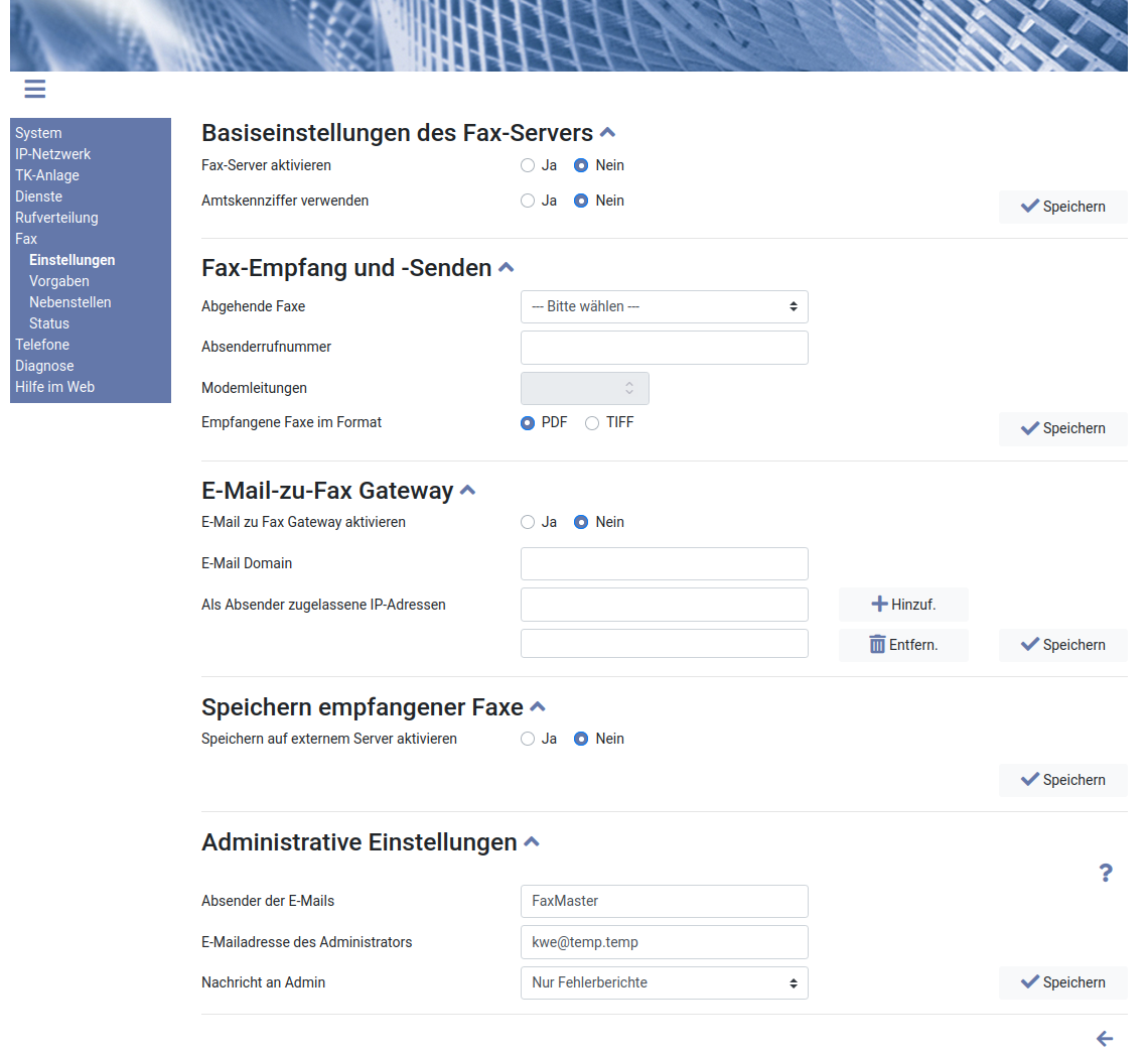 Nun können Sie ihren Fax-Server starten, indem Sie im Abschnitt „Basiseinstellungen des Fax-Servers“ den Radio-Button „Ja“ bei Fax-Server aktivieren anklicken und auf den zugehörigen Button „Speichern“ klicken. Sind Ihre Anwender es gewohnt, beim Fax anders als beim Telefonieren keine Amtskennziffer zu verwenden, können Sie durch die Auswahl „Nein“ bei „Amtskennziffer verwenden“ das sonst erforderliche Mitwählen der Amtskennziffer abschalten.