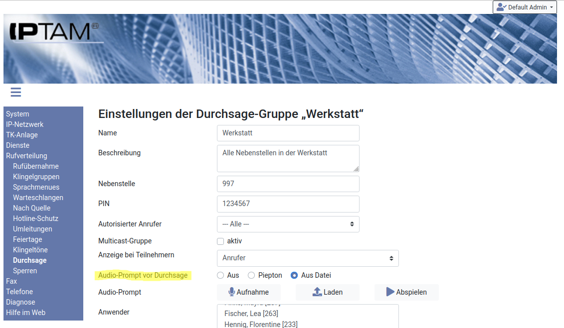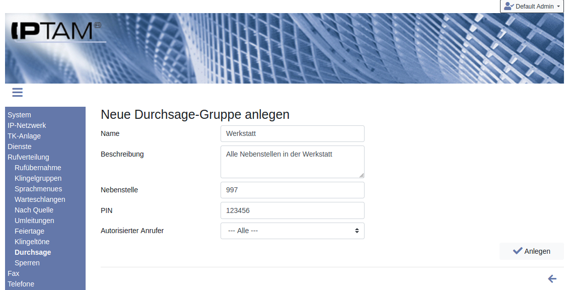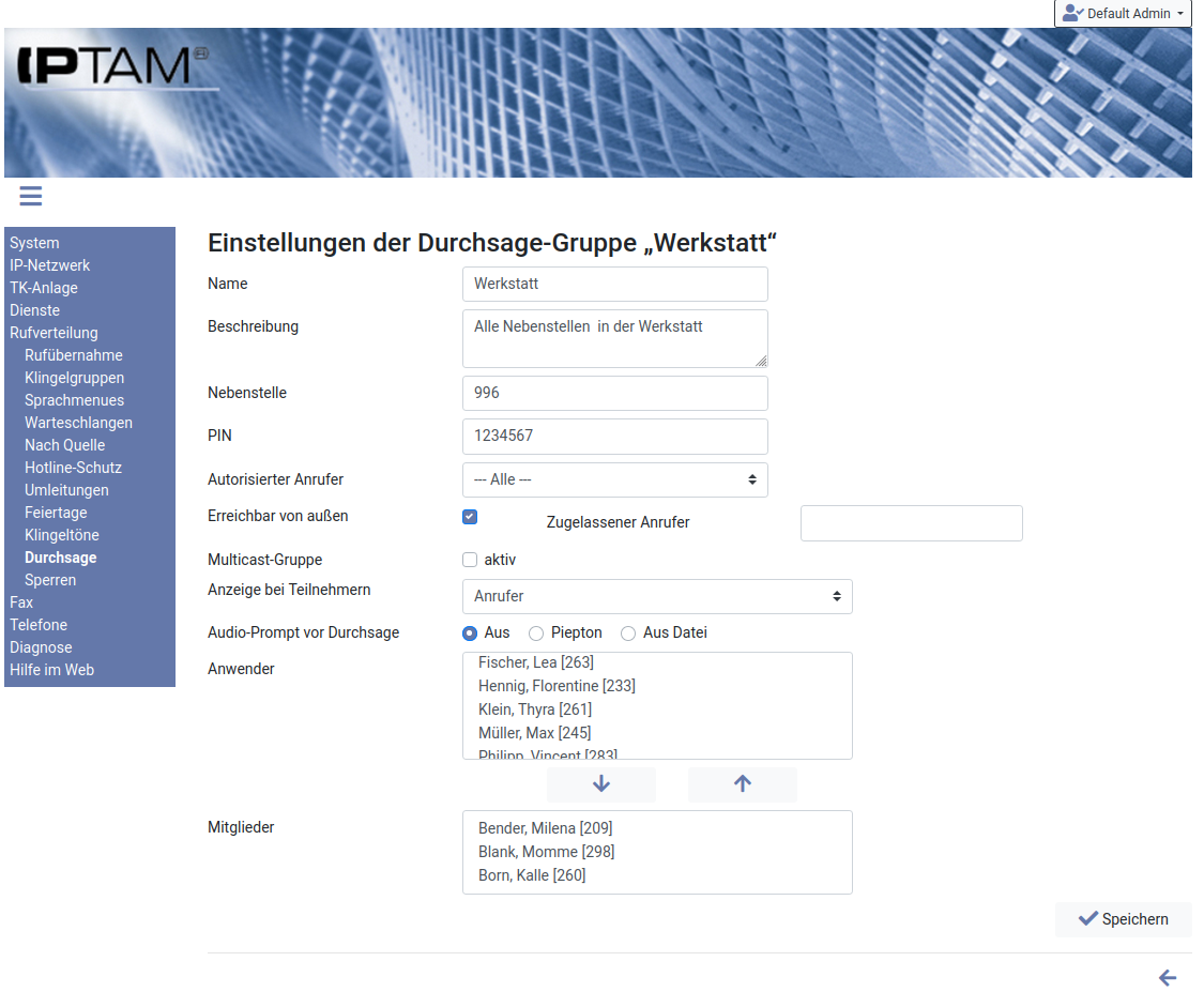 Sie vergeben einen Namen zu Dokumentationszwecken sowie eine kurze Beschreibung. Legen Sie eine Nebenstelle fest, die für eine Durchsage an diese Gruppe angerufen werden soll. Um Missbrauch zu verhindern, können Sie die Nutzung reglementieren: Sie können festlegen, dass nur ein bestimmter Anrufer eine Durchsage starten kann und Sie können eine PIN vergeben, die vor Auslösen der Durchsage-Funktion eingegeben werden muss.