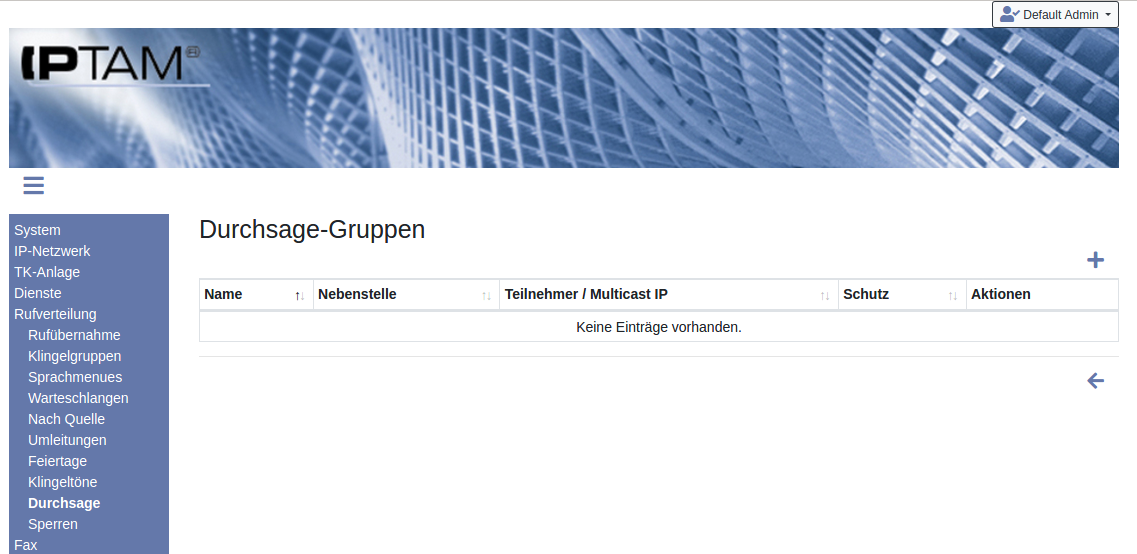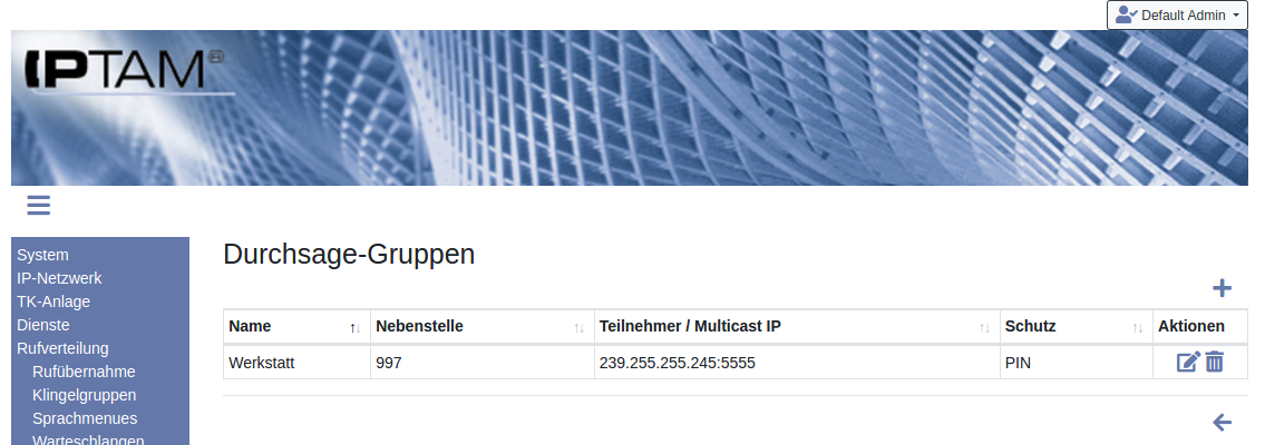 Mit Hilfe von Durchsage-Gruppen können Sie Anwendern erlauben eine Durchsage bei allen oder einem Teil der Nebenstellen durchzuführen. Der ausführende Anwender (oder der externe Anrufer) ruft die Nebenstelle der Gruppe an und autorisiert sich ggf. mit einer PIN, Anschließend beginnt er mit der Durchsage. Die in der Gruppe konfigurierten Telefone schalten beim Start der Durchsage den Lautsprecher ein und übertragen die Durchsage. Das Mikrofon der Telefone ist nicht aktiv. Der Durchsage kann ein Audio-Prompt (z.B. ein Gong) vorgeschaltet werden.Ein Gruppenanruf kann anstelle an eine Auswahl von Nebenstellen auch an eine Multicast-IP Adresse gerichtet werden. In diesem Fall werden alle Geräte, die den Multicast-Datenstrom empfangen können diesen wieder geben. Als Geräte können neben den Telefonen auch weitere Geräte wie z.B. auch Netzwerk-Lautsprecher eingesetzt werden.