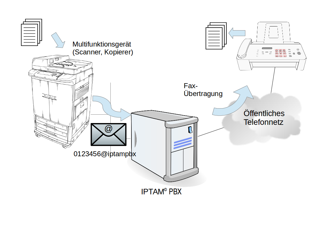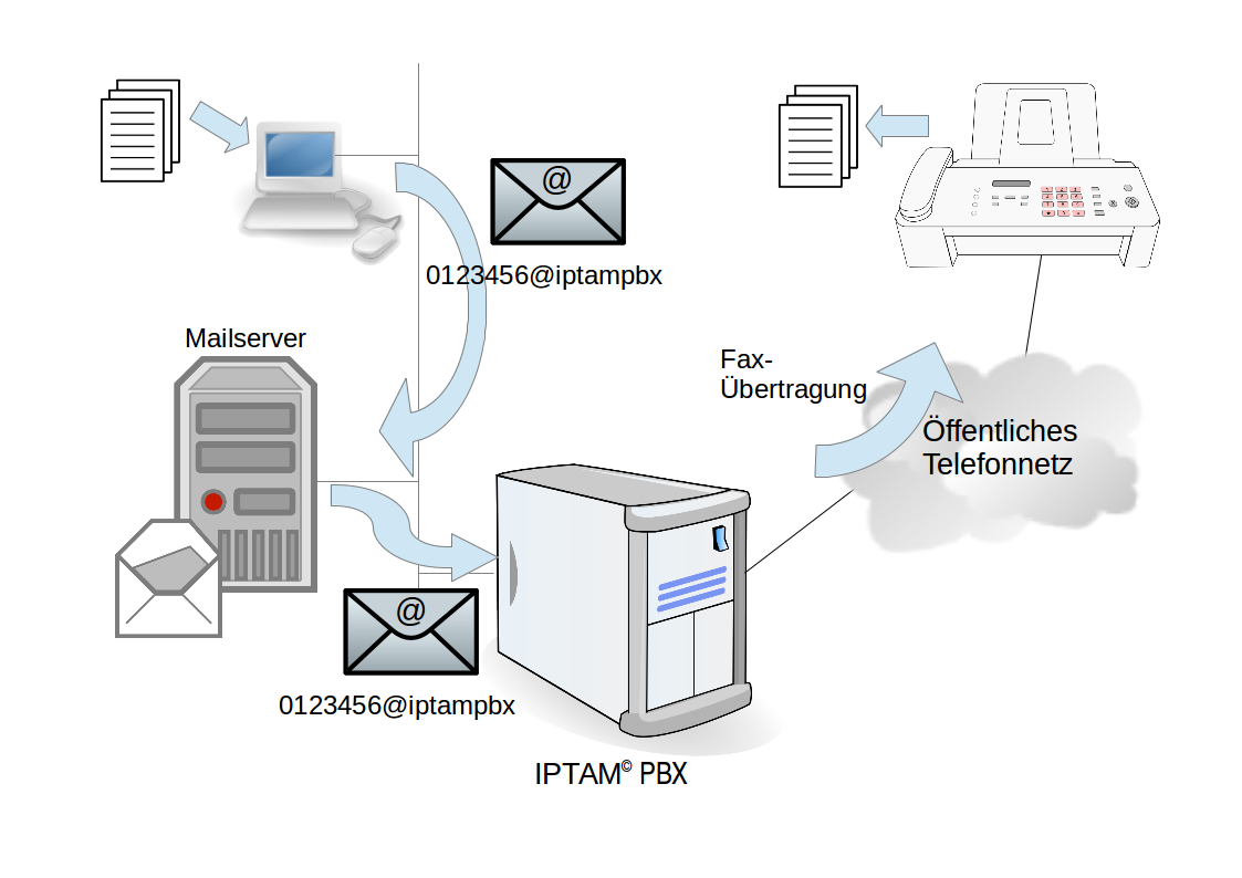Der Username (Anteil vor dem @-Zeichen) aus der Absender E-Mailadresse wird genutzt, um die Fax-Nebenstelle anhand des Accounts zu identifizieren. Wenn Sie also einen Anwender „Hans Mustermann“ mit dem Account „hans“ in Ihrer IPTAM PBX eingerichtet haben und die Telefonanlage eine E-Mail von „hans@example.com“ erhält, die an „0123456@fax.firma.de“ gerichtet ist, wird die Fax-Nebenstelle des Anwenders „Hans Mustermann“ genutzt, um das Fax an die Rufnummer „0123456“ zu versenden. Nach dem Versand erfolgt eine eventuelle Bestätigung an die für diese Nebenstelle hinterlegte E-Mail Adresse.