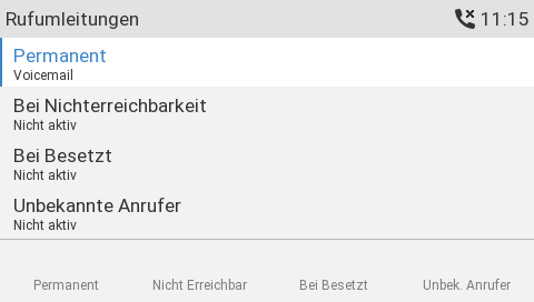 Image Bei dem Menü für Rufumleitungen werden die aktuellen Einstellungen in der Übersicht angezeigt und können mit einer der Tasten unter dem Display schnell verändert werden.