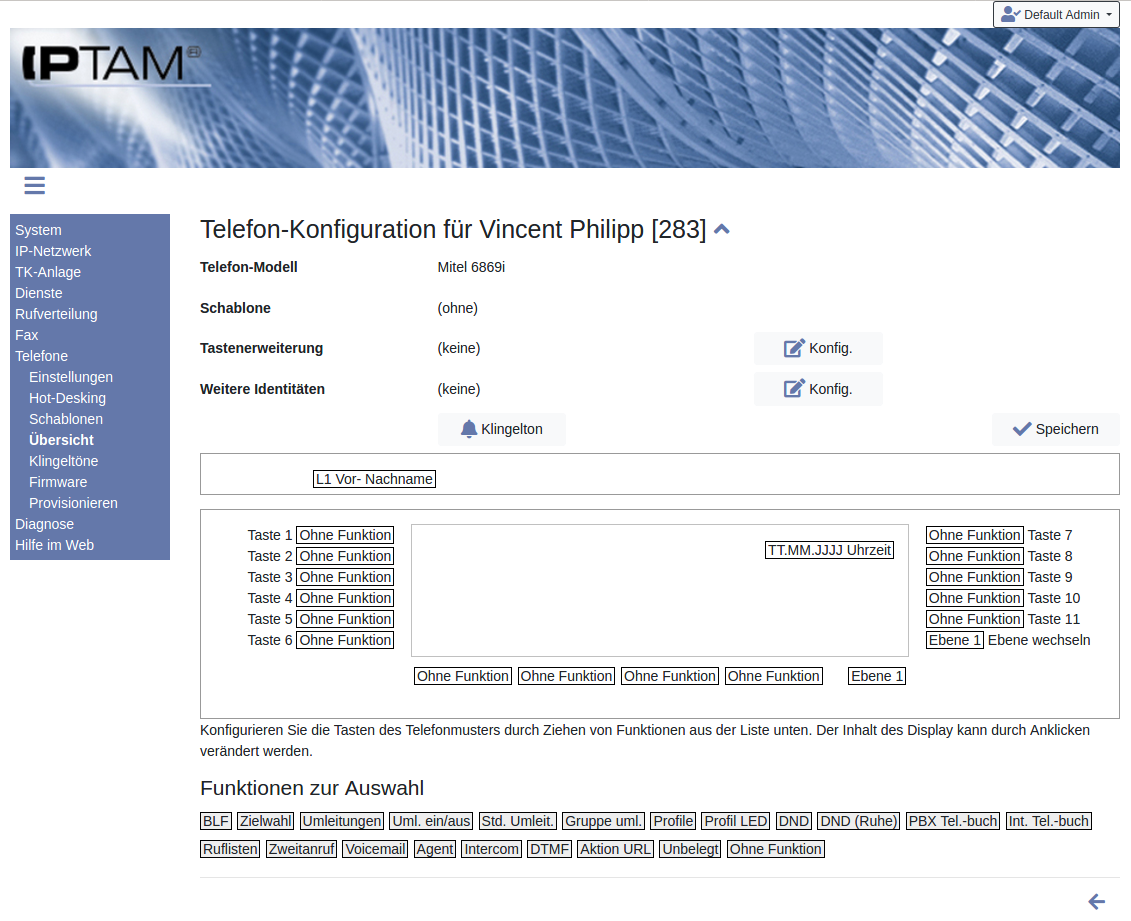 Es empfiehlt sich, in der Anlage die Zeitkonfiguration vorzunehmen, bevor die Telefone eingerichtet werden. Die Telefone finden ihre Konfiguration über eine per DHCP verteilte URL. Es wird daher empfohlen, den DHCP-Server der IPTAM® PBX einzusetzen1 und die Mitel (Aastra) Telefone als zu provisionierende Telefone auszuwählen.In der IPTAM® PBX legen Sie unter Telefone►Übersicht fest, welches Telefonmodell für einen Anwender zum Einsatz kommt und welche Tastenbelegung dafür vorgesehen ist. Das kann über die direkte Auswahl eines Telefonmodells oder mit Hilfe einer Schablone erfolgen.