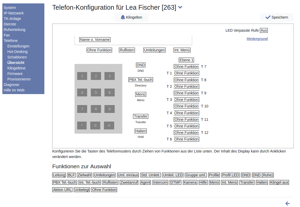 Image Sie konfigurieren die Funktionen des Telefons über Ihre IPTAM® PBX. Dazu können Sie die unter der schematischen Darstellung gezeigten Funktionen per Drag&Drop auf eine der Tasten platzieren (links sehen Sie als Beispiel ein D385). Wenn die Funktion weitere Angaben (z.B. für die Tastenbeschriftung) benötigt, öffnet sich ein Dialog. Diesen erreichen Sie auch nachträglich durch Anklicken der konfigurierten Taste. Eine Beschreibung der Tastenfunktionen haben wir hier alphabetisch gelistet.