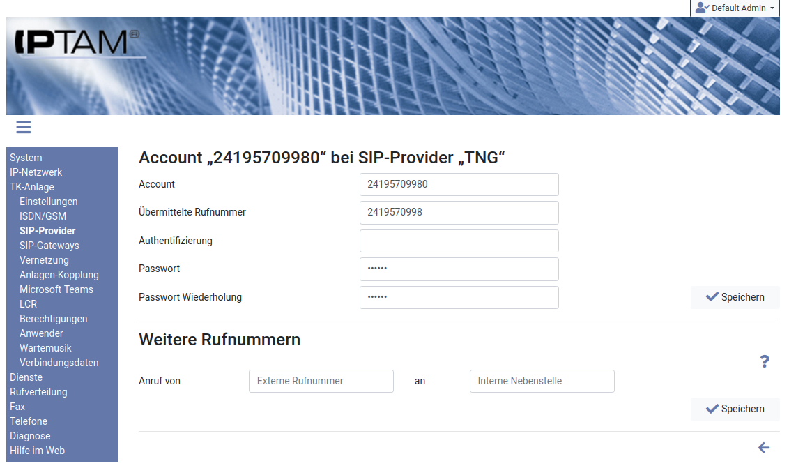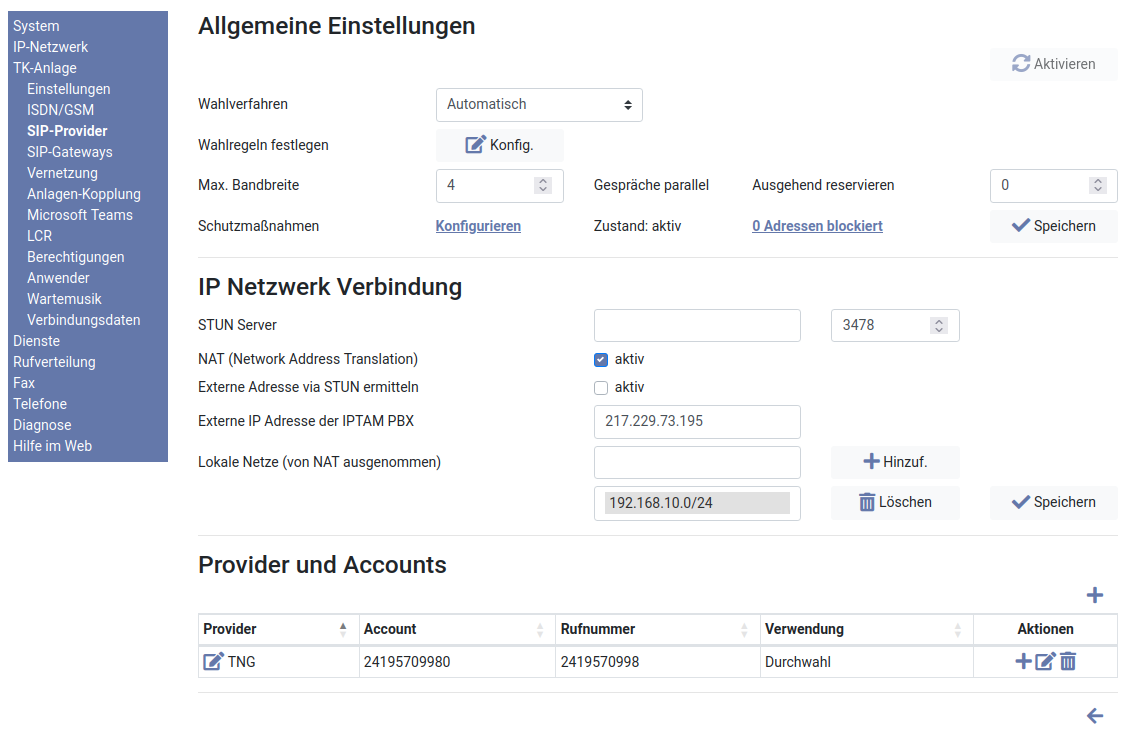 Der Provider TNG konfiguriert die SIP-Anschlüsse in der Regel so, dass Anrufe aus dem eigenen Ortsnetz ohne Ortsnetzkennzahl übergeben werden. Bitte informieren Sie TNG, dass die Anrufe ungekürzt übergeben werden, da die IPTAM@ PBX die Anrufe sonst nicht korrekt annehmen kann.