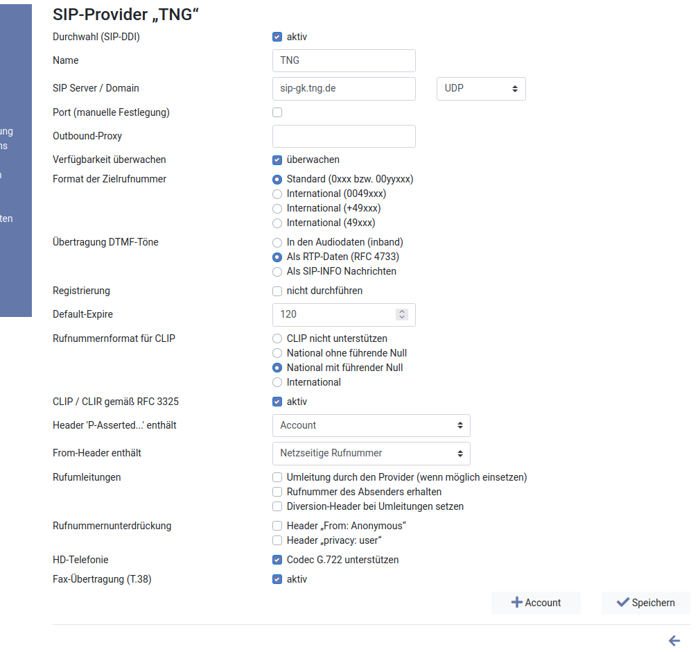 Einstellungen: SIP Anlagenanschluss (TNG Stadtnetz GmbH)