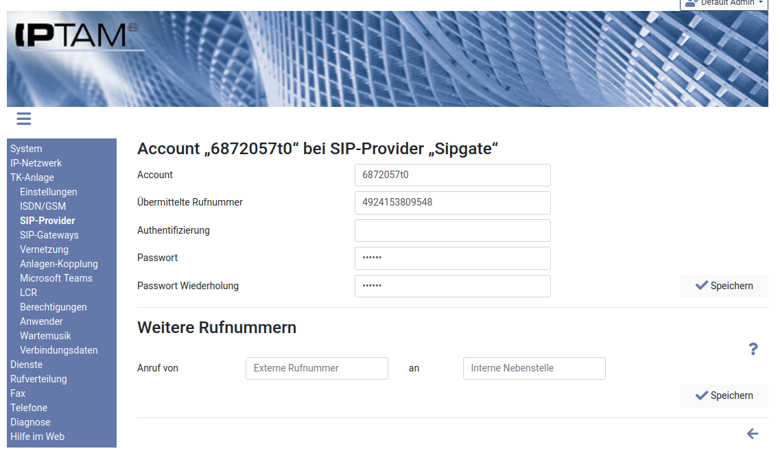 Image Mit dem Account registriert sich Ihre IPTAM® PBX beim Provider. Tragen Sie die Daten wie beispielhaft in der Abbildung gezeigt ein.