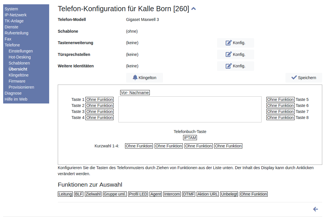 Image Sie konfigurieren die Funktionen des Telefons über Ihre IPTAM® PBX. Dazu können Sie die unter der schematischen Darstellung gezeigten Funktionen per Drag&Drop auf eine der Tasten platzieren (links sehen Sie als Beispiel ein Maxwell 3). Wenn die Funktion weitere Angaben (z.B. für die Tastenbeschriftung) benötigt, öffnet sich ein Dialog. Diesen erreichen Sie auch nachträglich durch Anklicken der konfigurierten Taste. Eine Beschreibung der Tastenfunktionen haben wir hier alphabetisch gelistet.