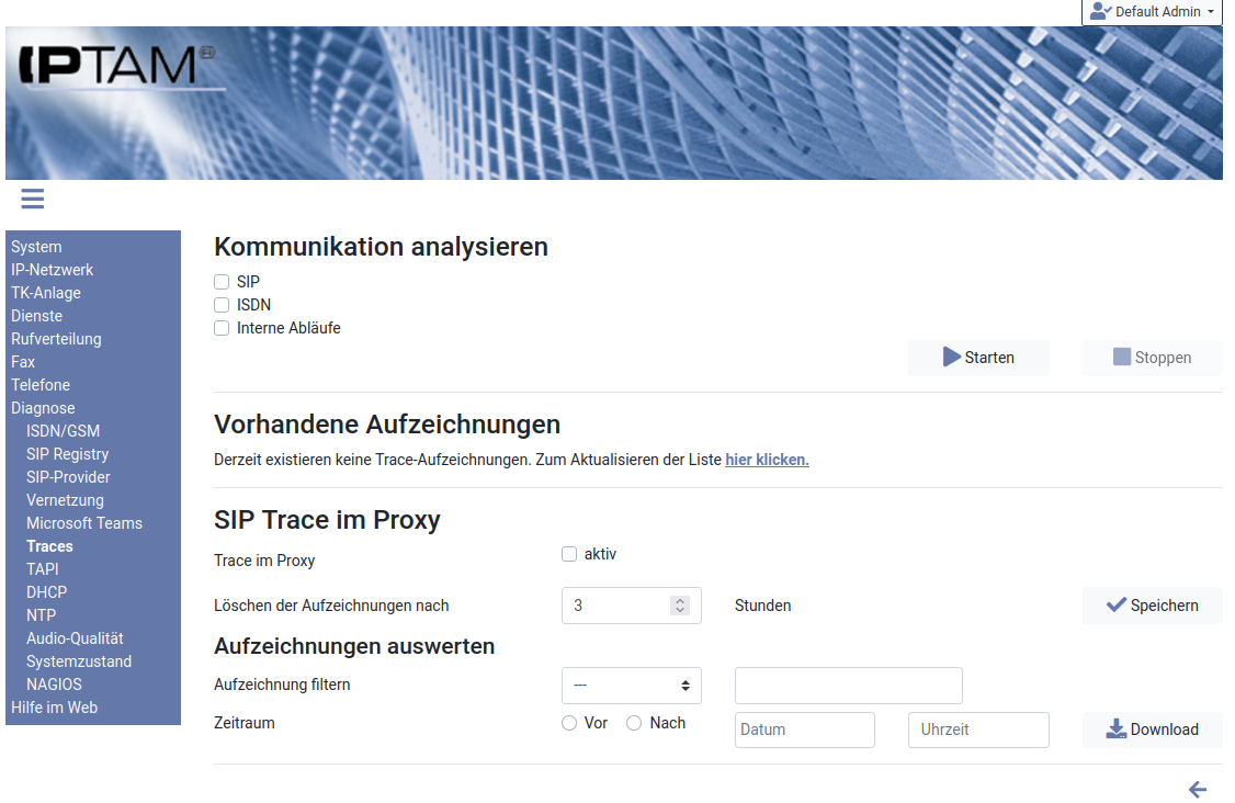 Image Zu Diagnosezwecken bietet Ihnen Ihre IPTAM® PBX die Möglichkeit SIP Nachrichten oder ISDN Nachrichten aufzuzeichnen, die von oder zu Ihrer IPTAM® PBX gesendet werden. Ebenso können Sie interne Abläufe der Anlage aufzeichnen.