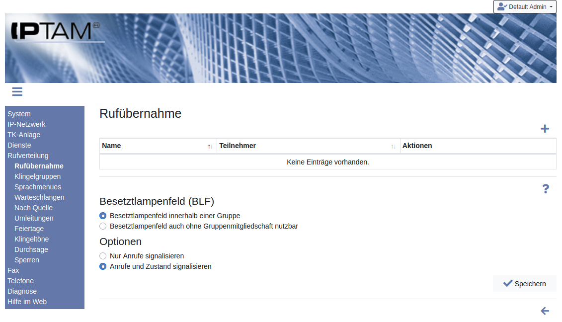 Rufübernahme beschreibt die Möglichkeit, eingehende Anrufe, die an eine Nebenstelle gerichtet sind, von anderen Mitgliedern der Übernahmegruppe übernehmen zu können. Die Einrichtung der Übernahmegruppen erfolgt über das Menü Rufverteilung►Rufübernahme. Die Tastenfolge zur Rufübernahme legen Sie im Menü Dienste►Rufnummern fest. Bei Telefonen, die die Funktion „Besetztlampenfeld“ (BLF) bieten, stellen sich Anrufe als blinkende Taste dar, u.U. wird auch der Anrufer im Display angezeigt. Durch einen Druck auf die Taste wird dann die Rufübernahme ausgeführt. Diese Funktion kann auch losgelöst von Übernahmegruppen genutzt werden (s.u.).