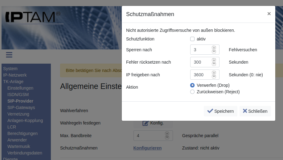 Im Normalfall wird die IPTAM® PBX eine Fehlermeldung bei einem Registrier-Versuch senden. Wenn ein Angreifer per automatisiertem Skript versucht, SIP-Account und Passwort zu raten, wird das zwar nicht zum Erfolg führen, der Netzwerk-Verkehr belastet aber unnötig Ihre Ressourcen.